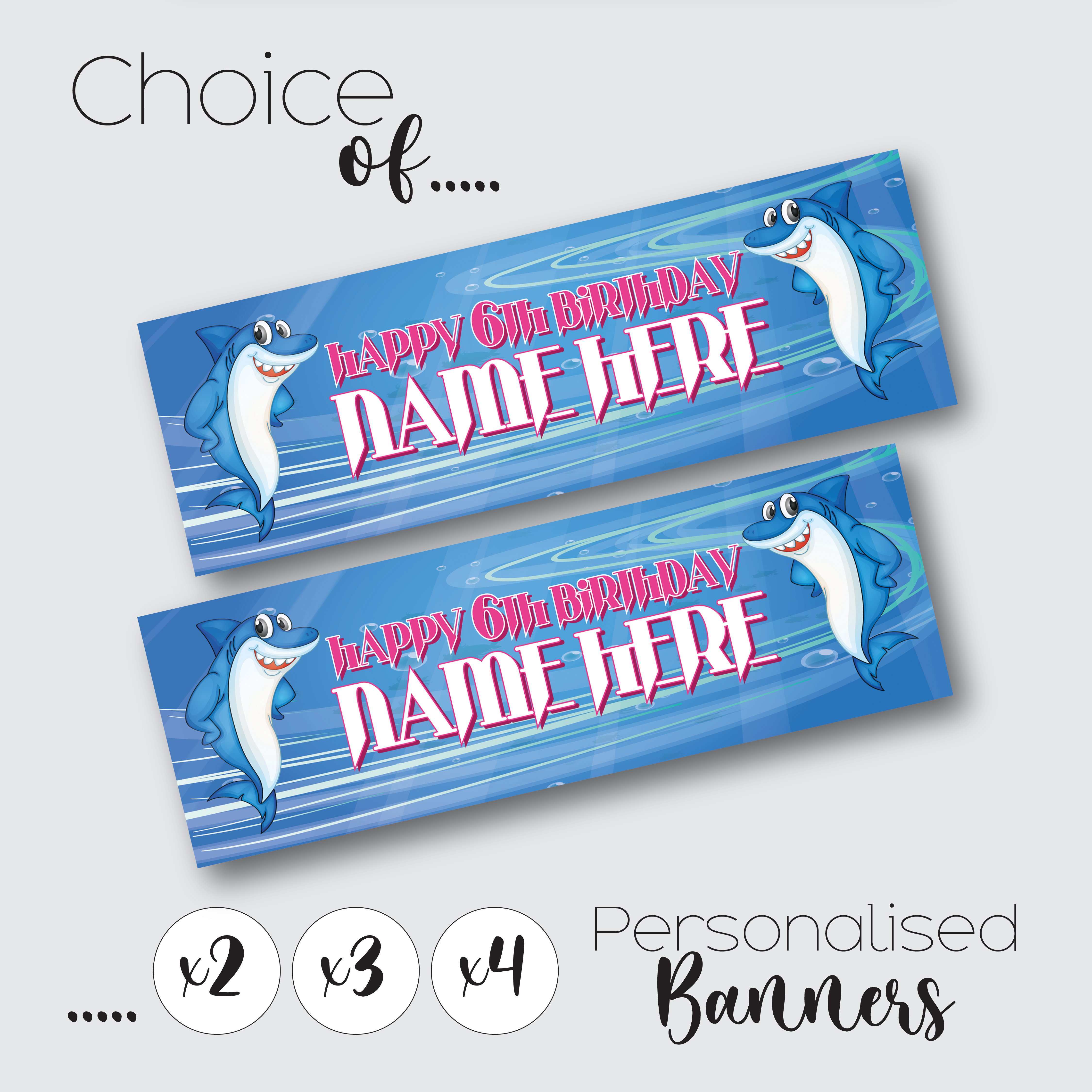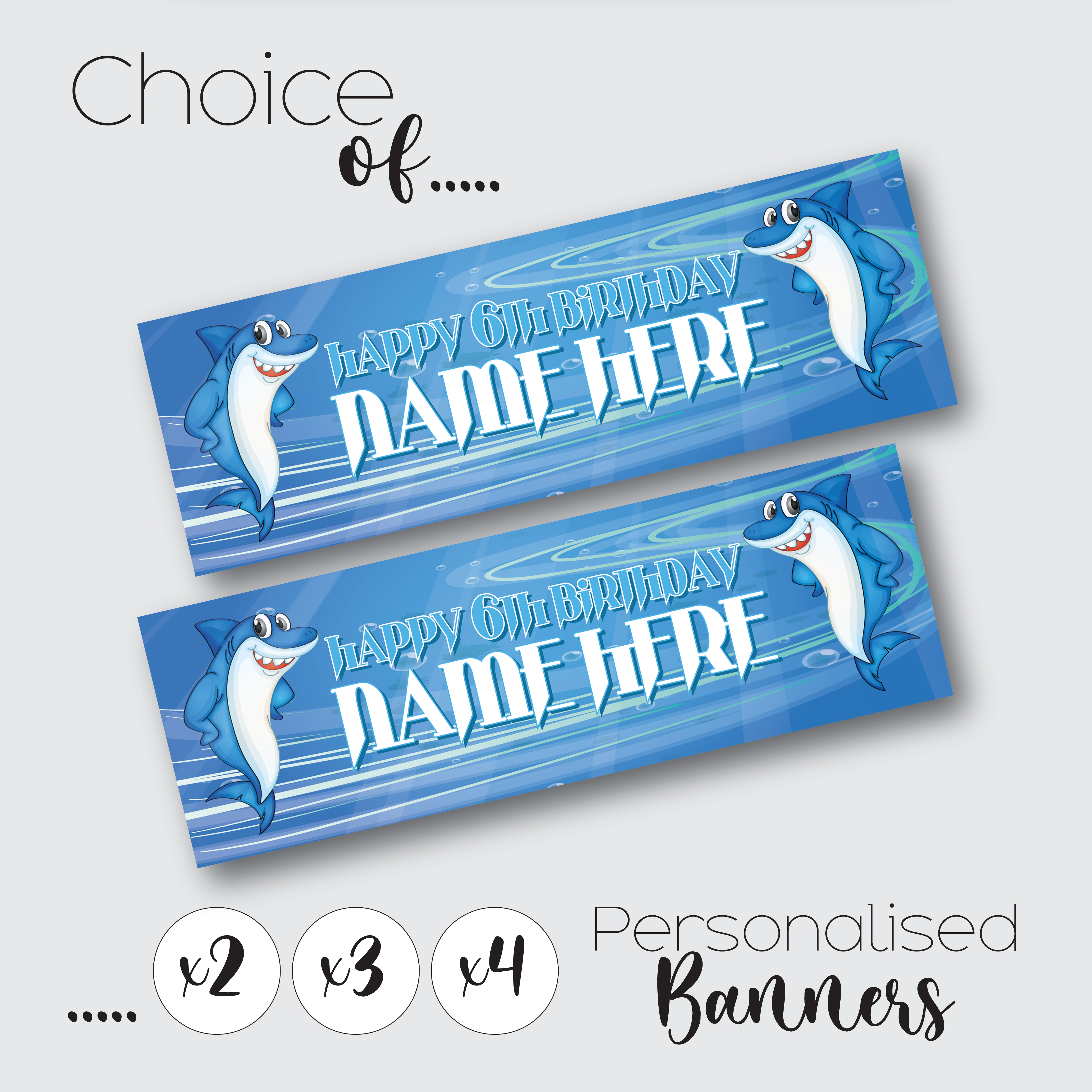 Personalised Shark Birthday Banner for Kids – Custom Paper Party Decoration, Available in Sets of 2, 3 or 4