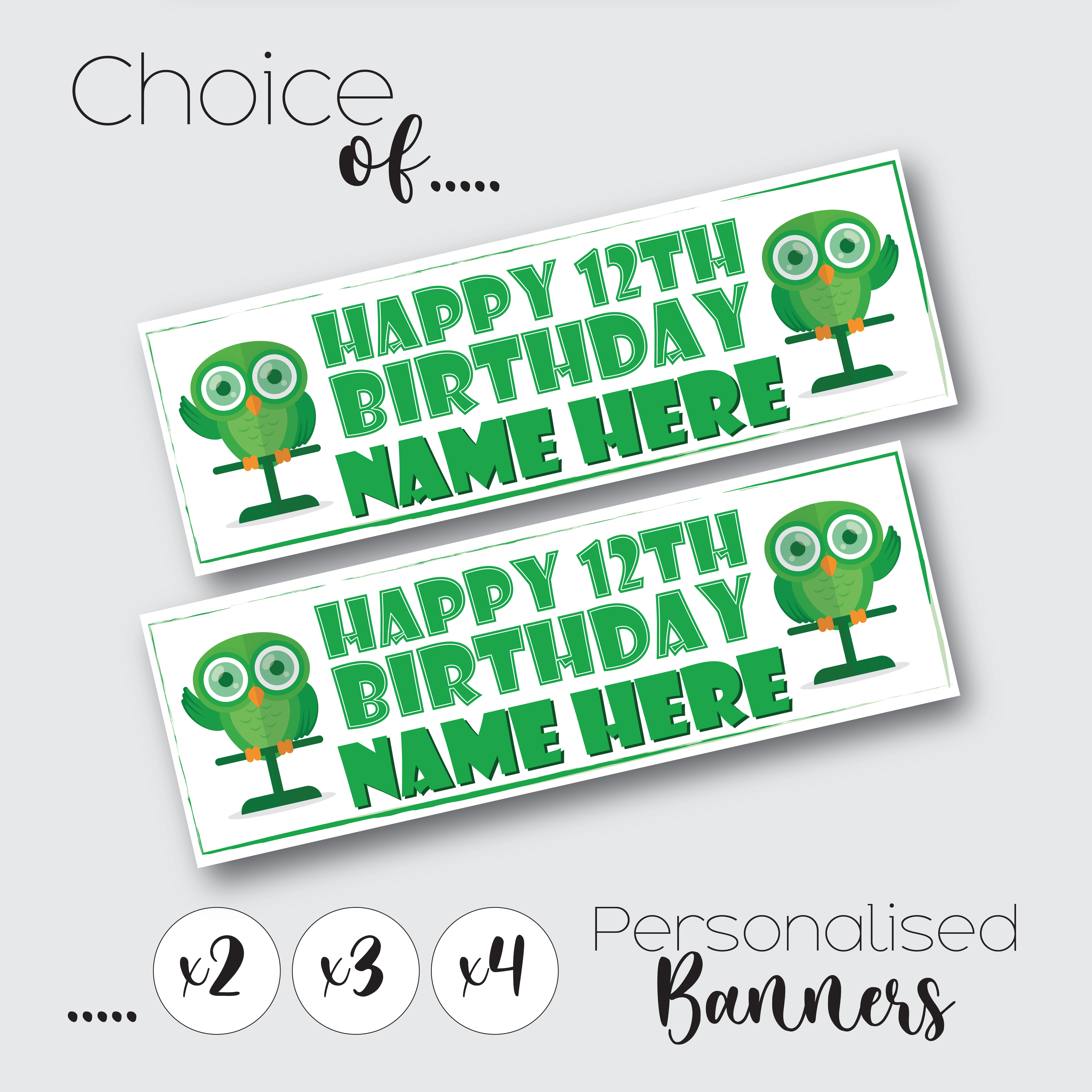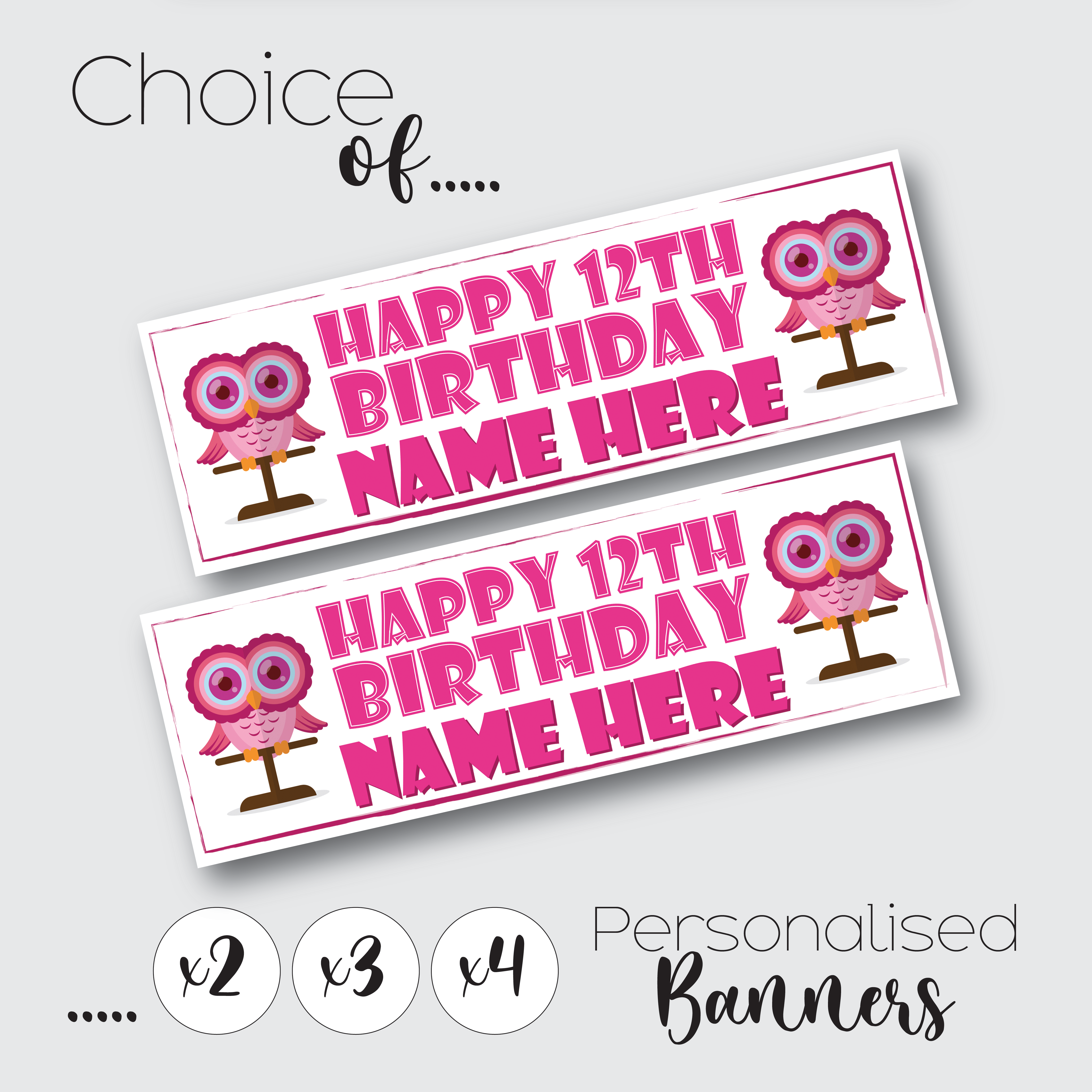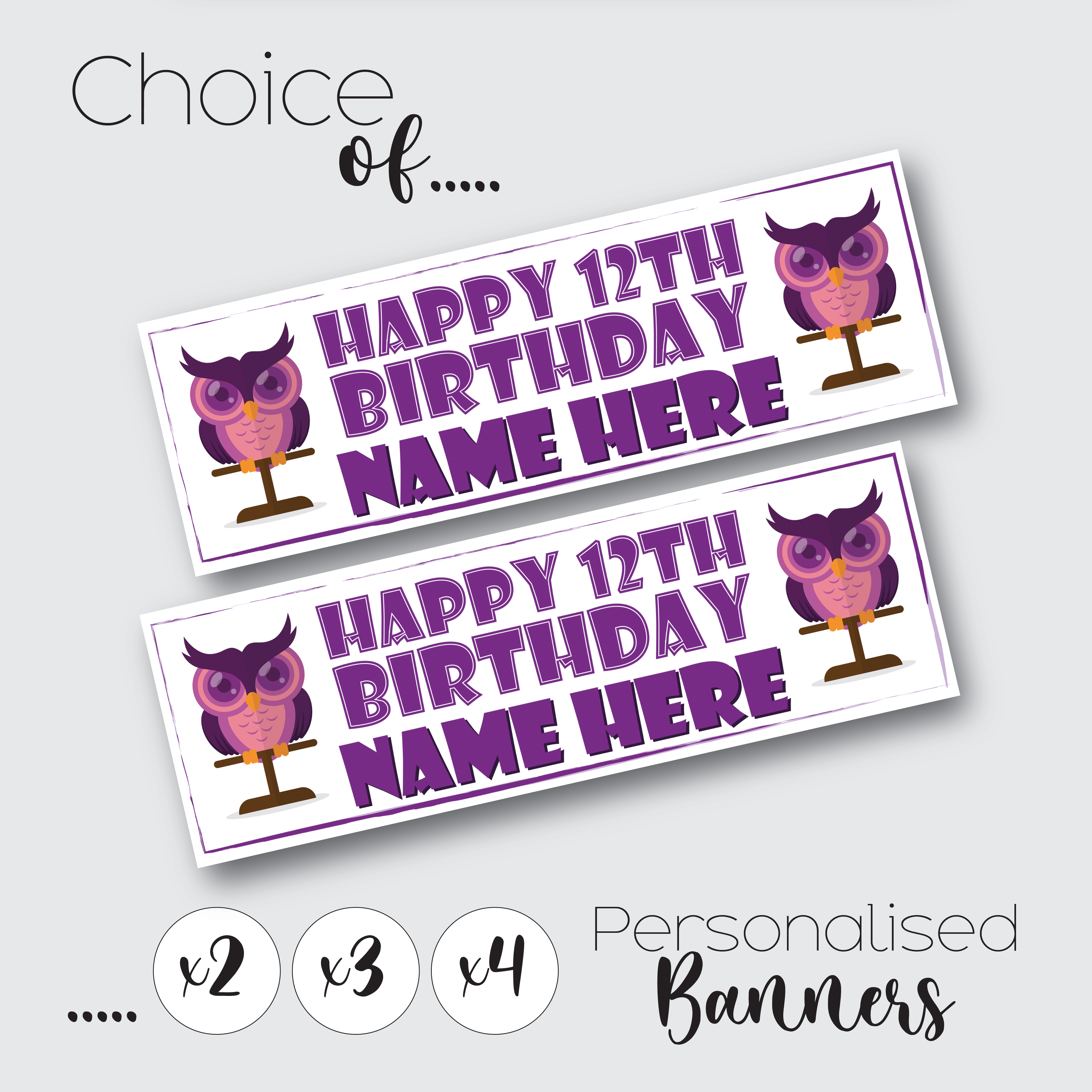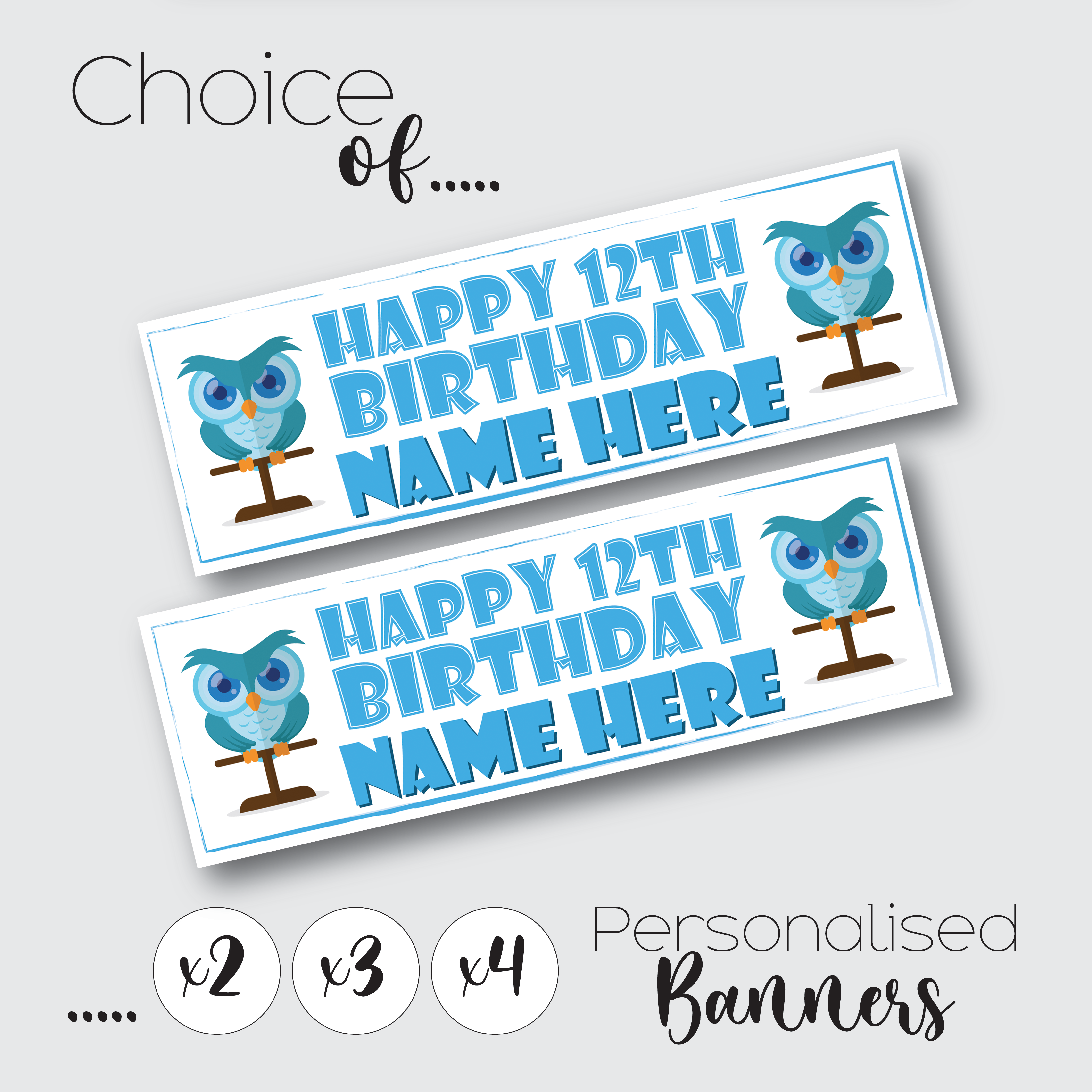 Personalised Owl Birthday Banner for Kids – Custom Paper Party Decoration, Available in Sets of 2, 3 or 4