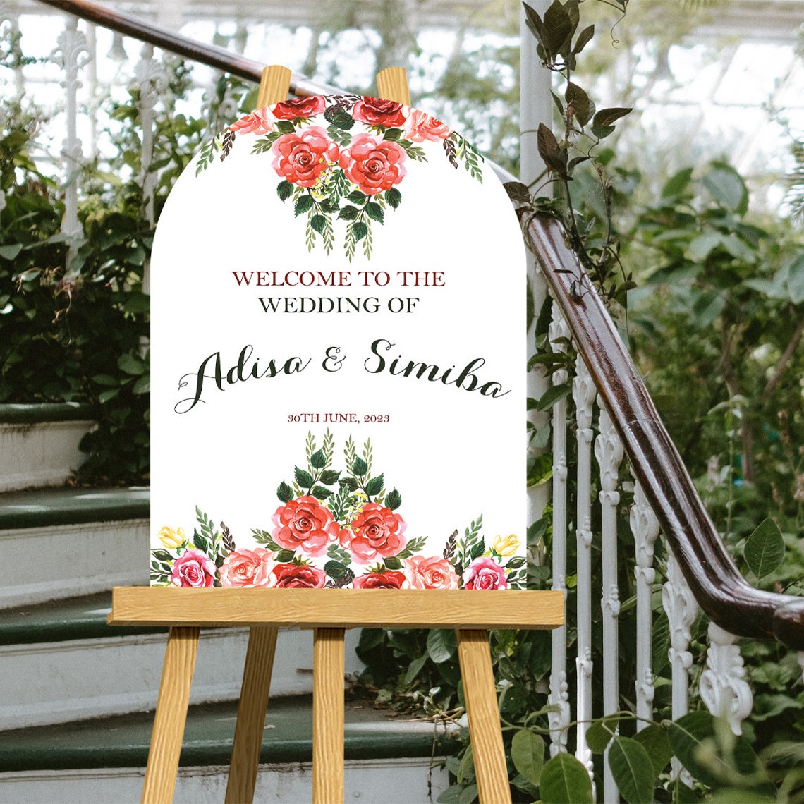 RED ROSES Arch Welcome Sign, Printed Sign A1 or A2, Welcome Order of the Day, Pink Peach Cream Roses, Personalised Wedding Welcome Sign 0026