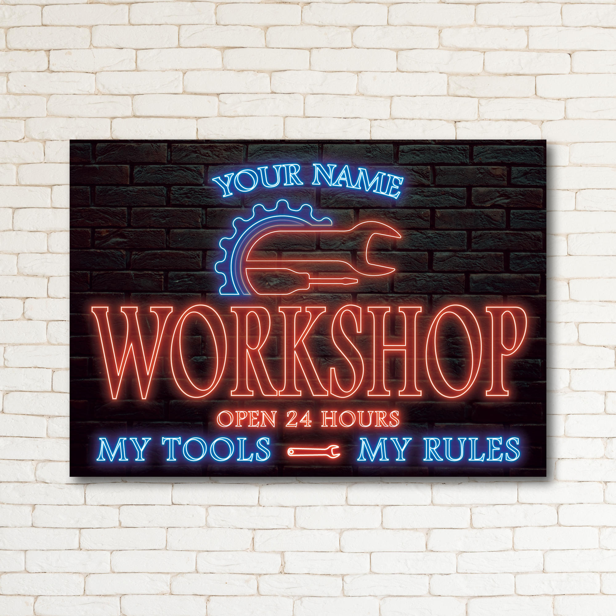 PERSONALISED Workshop Sign Tool Shed Garage Neon Effect Metal Plaque Custom Gift 0507