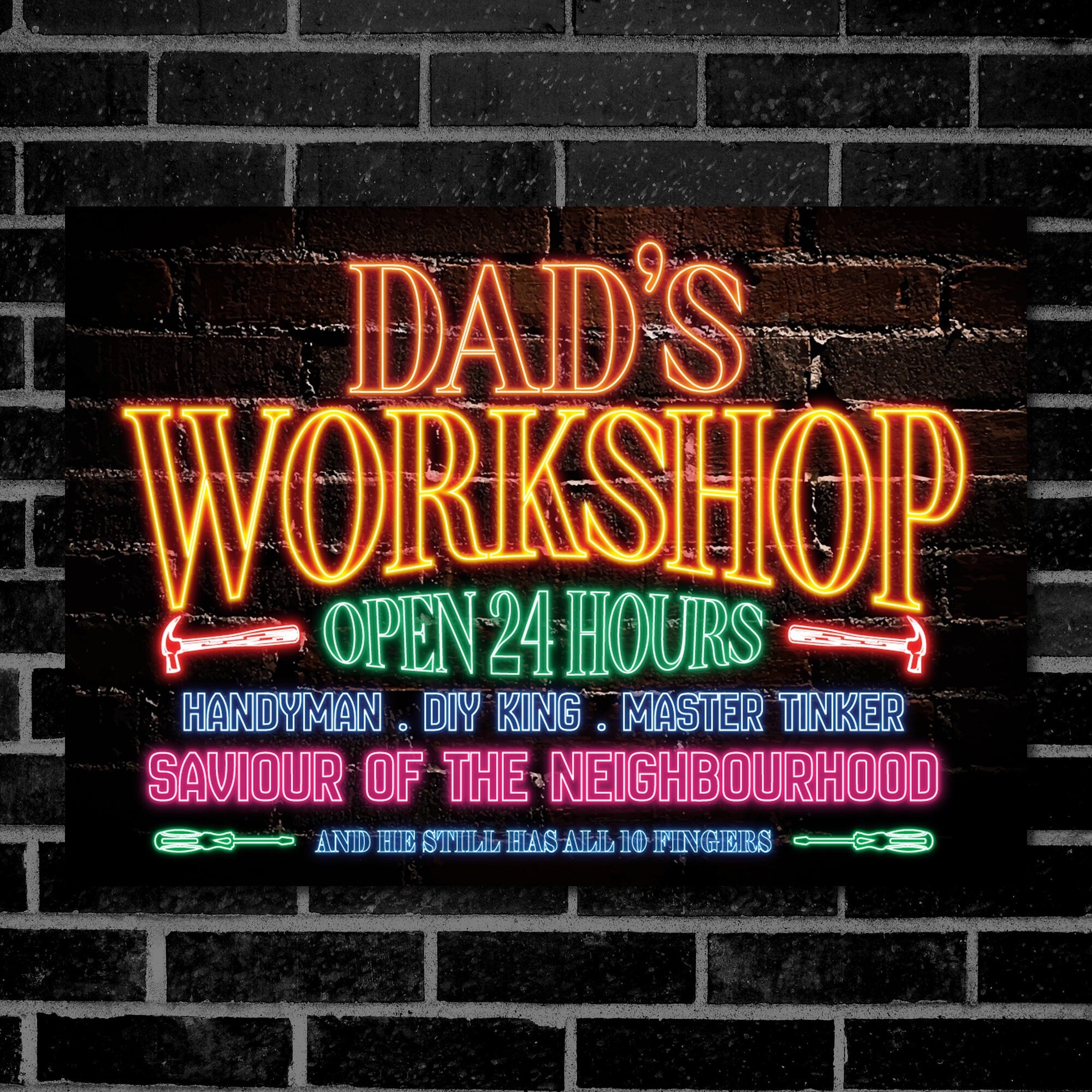 PERSONALISED Dad's Workshop Metal Sign Shed Garage Neon Effect Gift Idea Plaque 0509